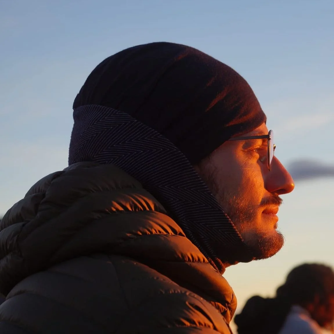 Un homme portant un bonnet noir, des lunettes et une veste chaude regarde vers la droite lors d'un coucher de soleil.